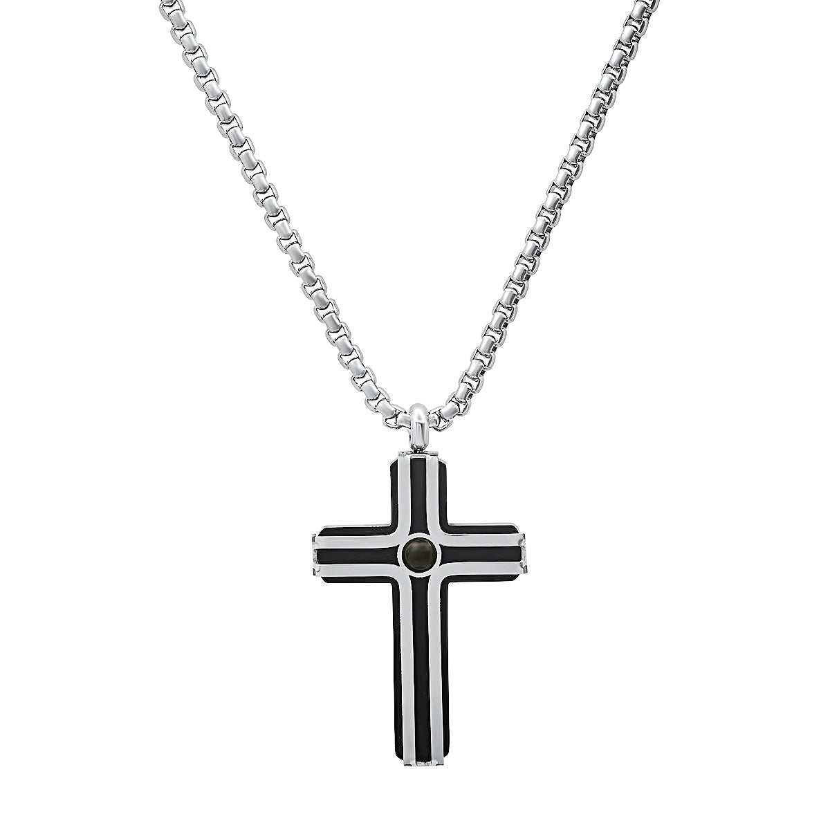 Refined and modern, this two-tone cross pendant features sleek black IP plating paired with polished stainless steel, complemented by a strand of matte black beads for a bold, contemporary look.