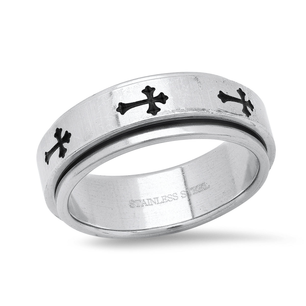 Spin some style into your day! This stainless steel ring features black IP cross accents and a smooth spinner band — perfect for fidgeting with flair.