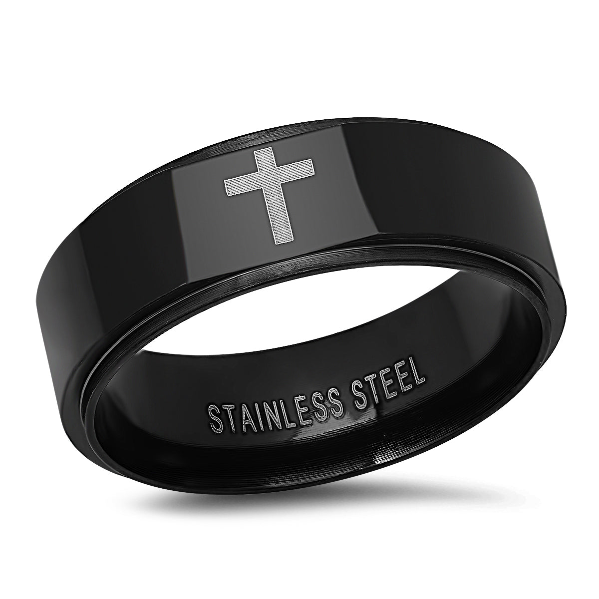 A bold and edgy black IP stainless steel band ring, featuring a sleek cross design for standout style with a strong statement of faith.