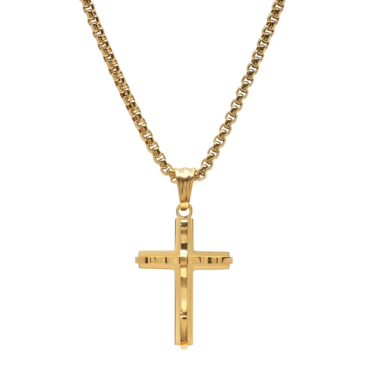 A striking piece, this 18K gold-plated stainless steel pendant features a bold double-layer ridged cross design for a modern, edgy look.