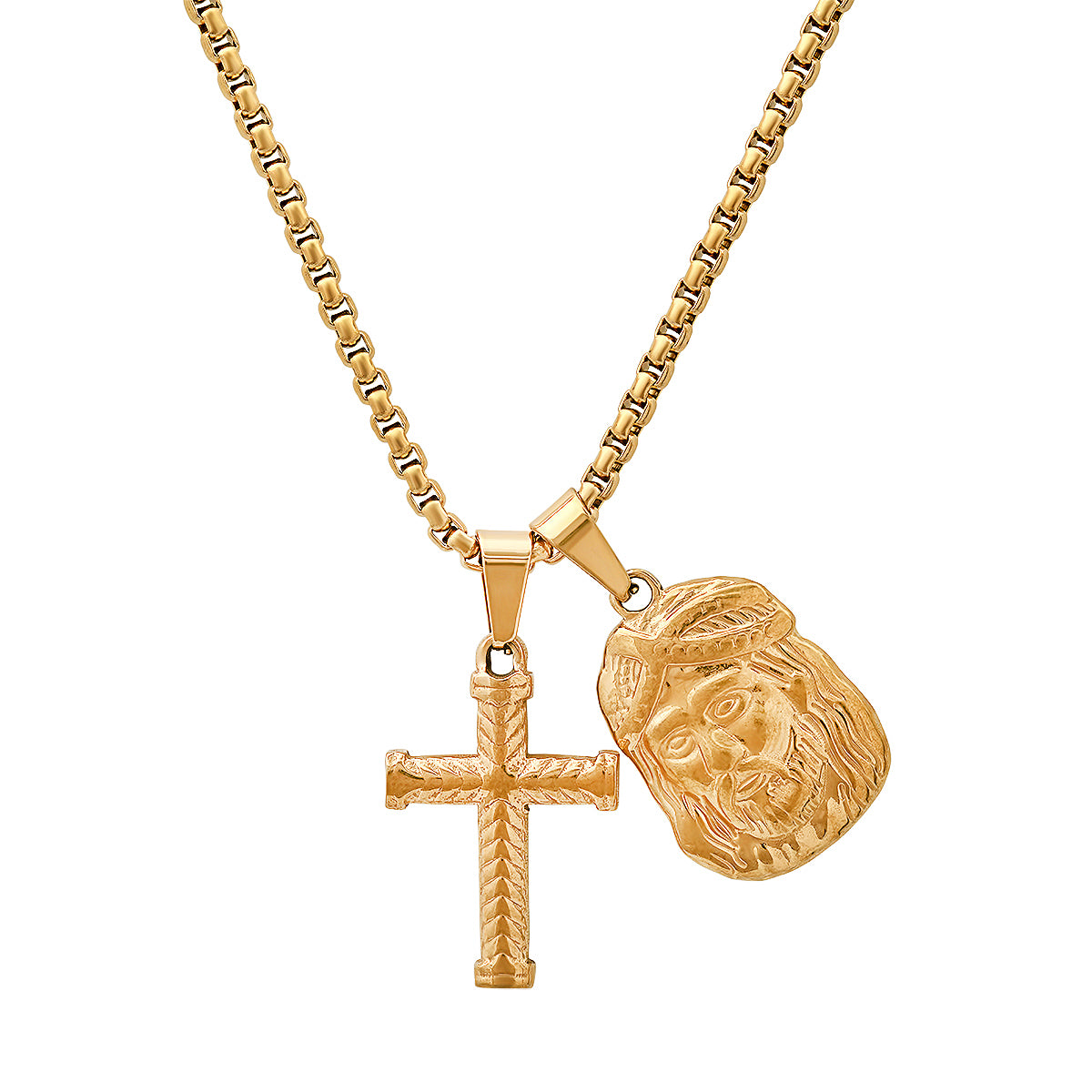 Refined and radiant, this 18K gold-plated stainless steel set features a bold cross and detailed Jesus face pendant — a powerful expression of faith and divine strength.