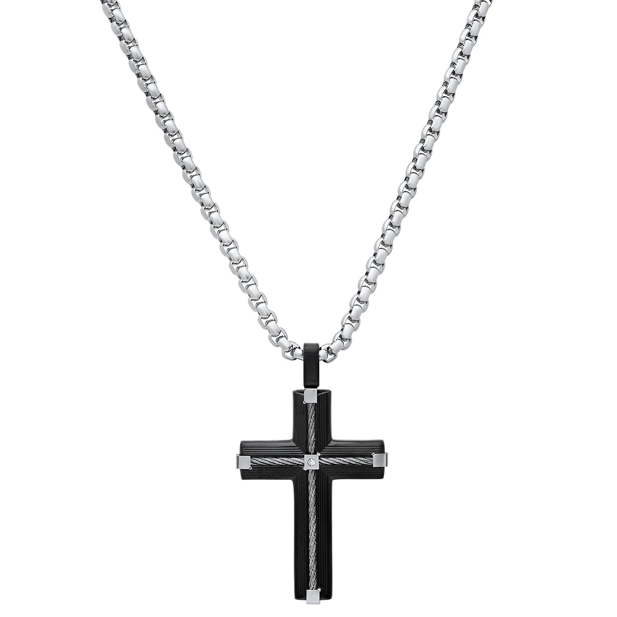 Industrial-style pendant featuring a two-tone black IP and stainless steel inlay wire cable cross, accented with simulated diamonds for a rugged yet refined look.