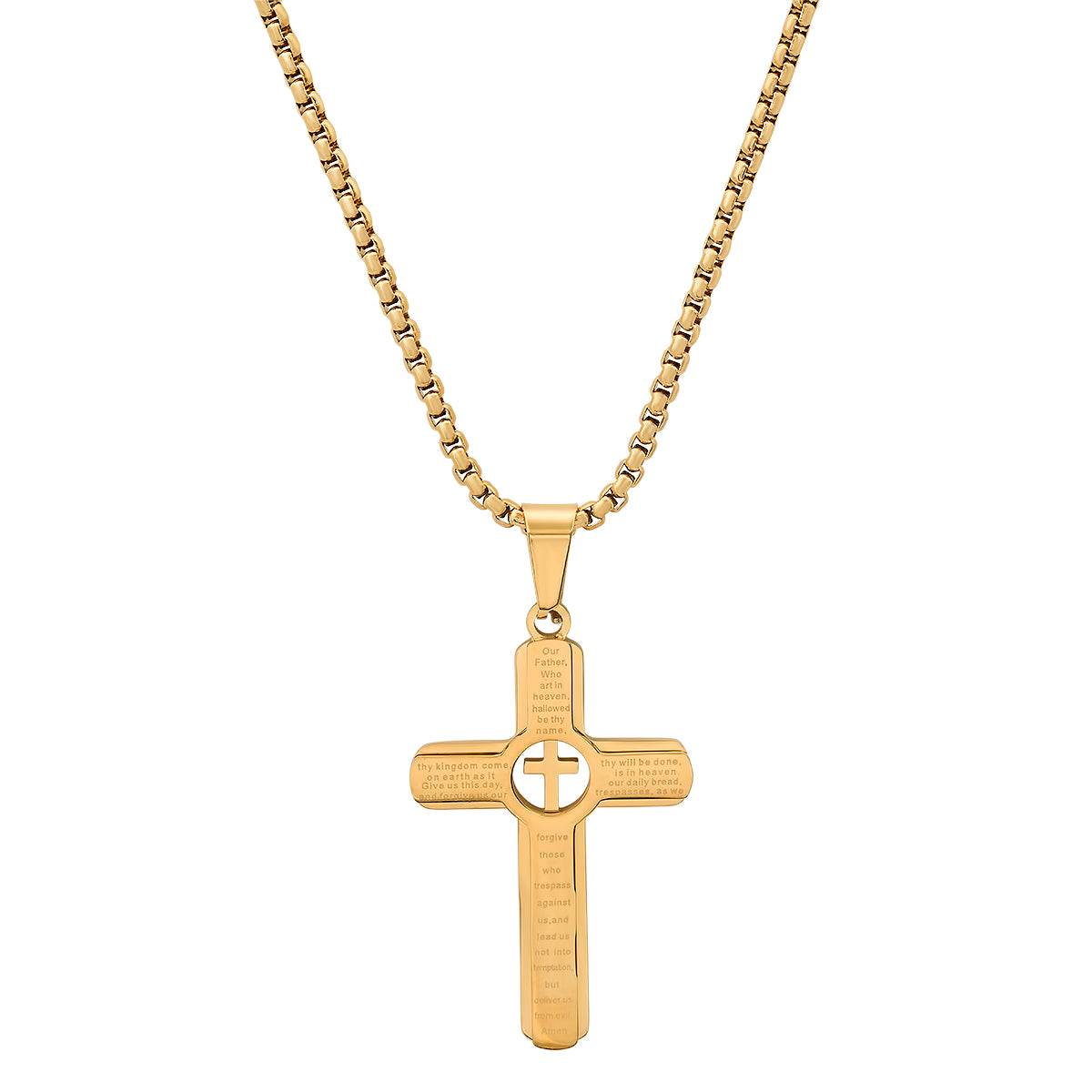 Pray in style with SteelTime's Lord’s Prayer Cross pendant! This unique cross pendant features a beautiful prayer engraved on its surface and hallowed out center with another mini cross withing. A perfect reminder of faith, this pendant is a must-have for any stylish believer.
