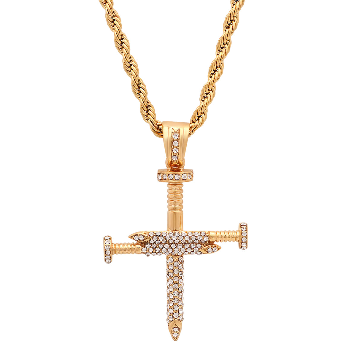Crafted for distinction, this 18K gold-plated stainless steel cross pendant features a nail-inspired design, adorned with brilliant simulated diamonds — a bold fusion of luxury and meaning.