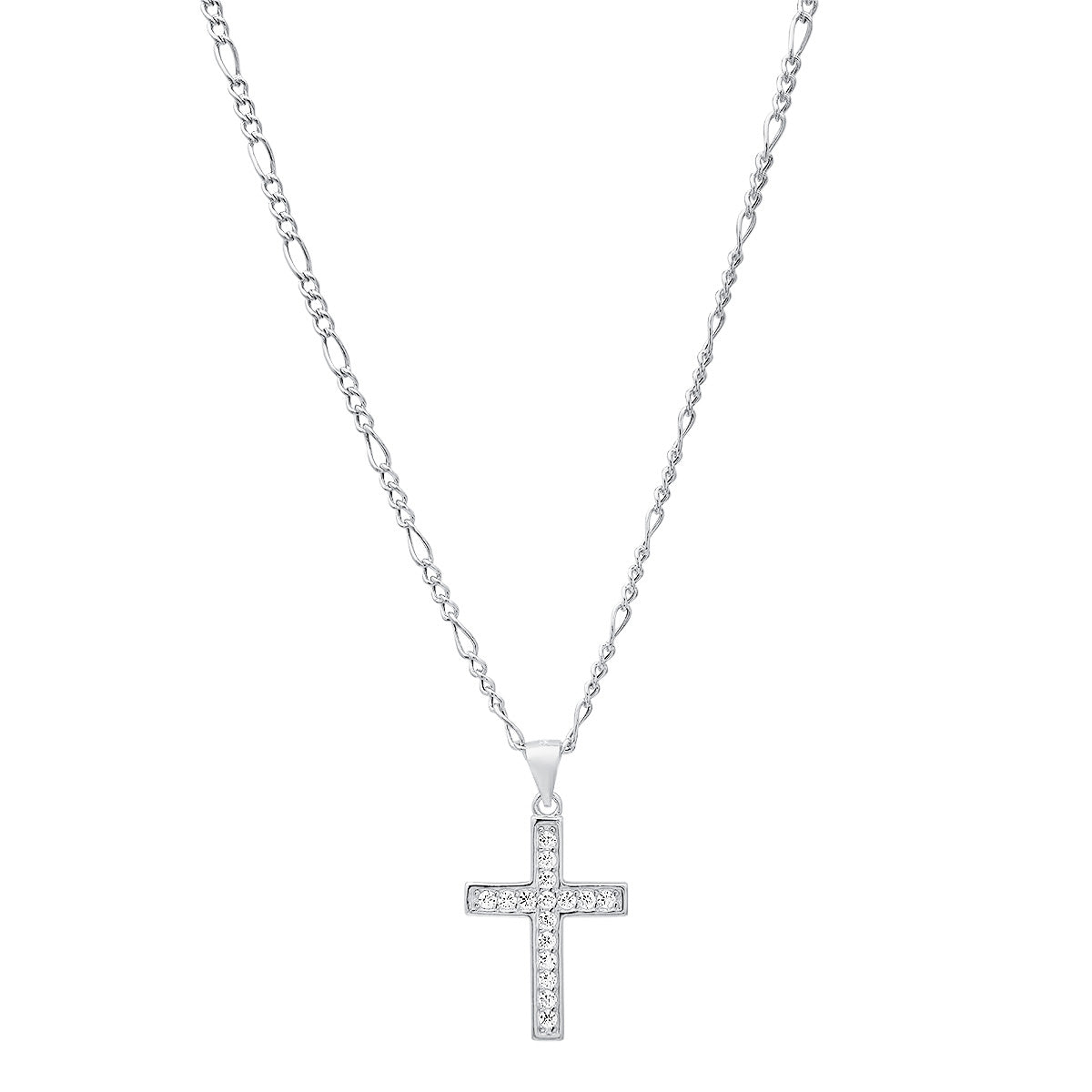 Sleek and stylish, this unisex sterling silver Figaro chain pairs perfectly with a simulated diamond cross for a modern, radiant look.